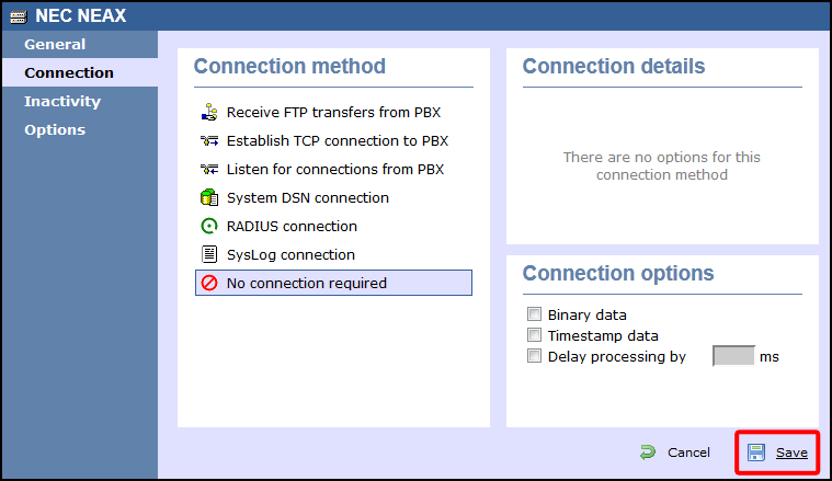 3. A new window will open, displaying the general properties of your PBX object. Select NEC NEAX from the Data format list and tick the Keep a local backup of data box, as shown below: NEC NEAX TIM PBX